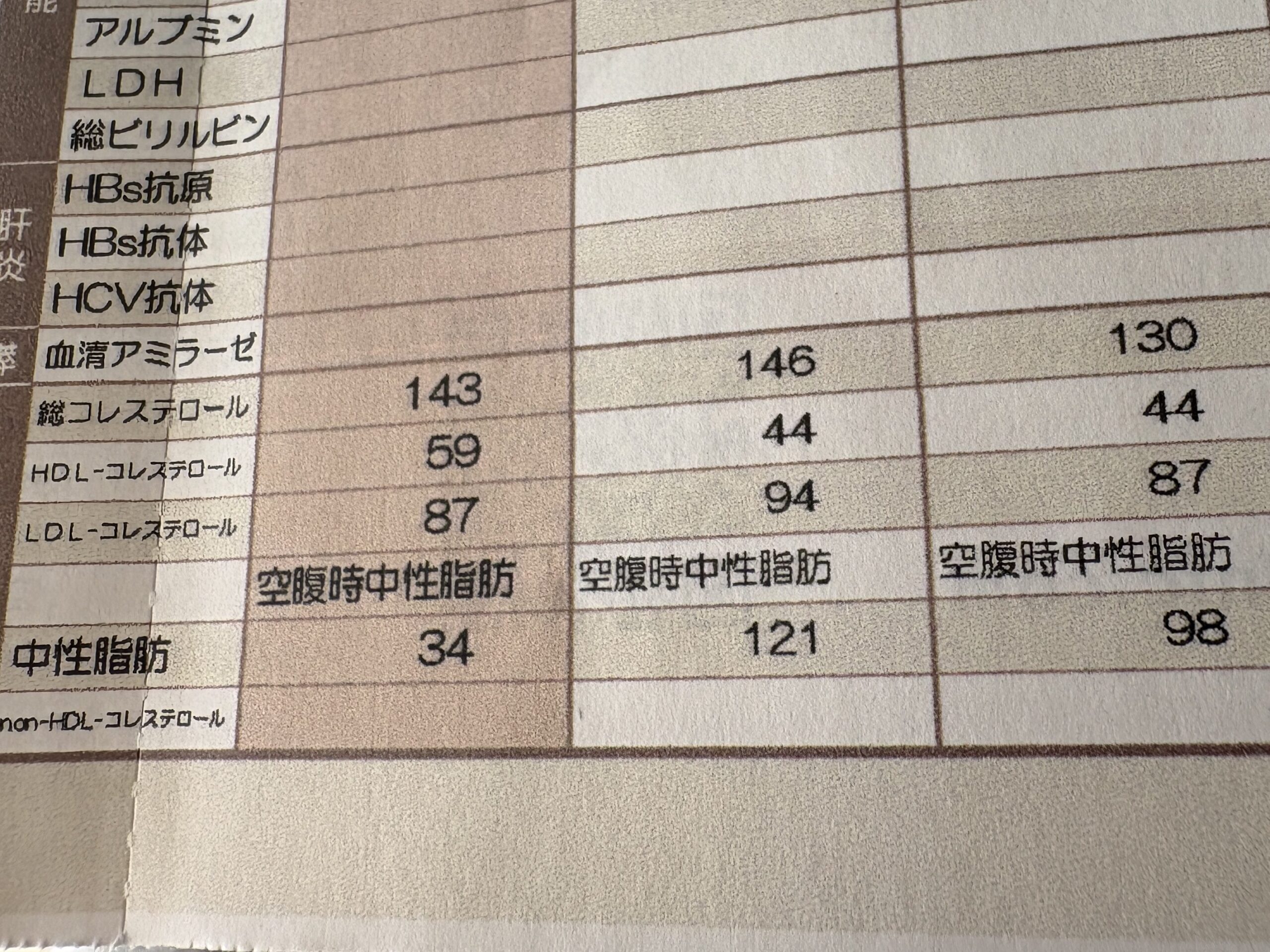 | 空腹時中性脂肪 | 98mg/dL | 34mg/dL | -64mg/dL |