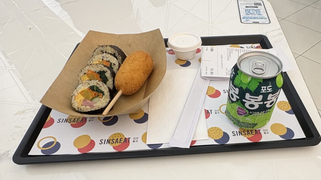私は韓国料理店でキンパとチーズハットグとドリンクのセット(1725円)を注文。