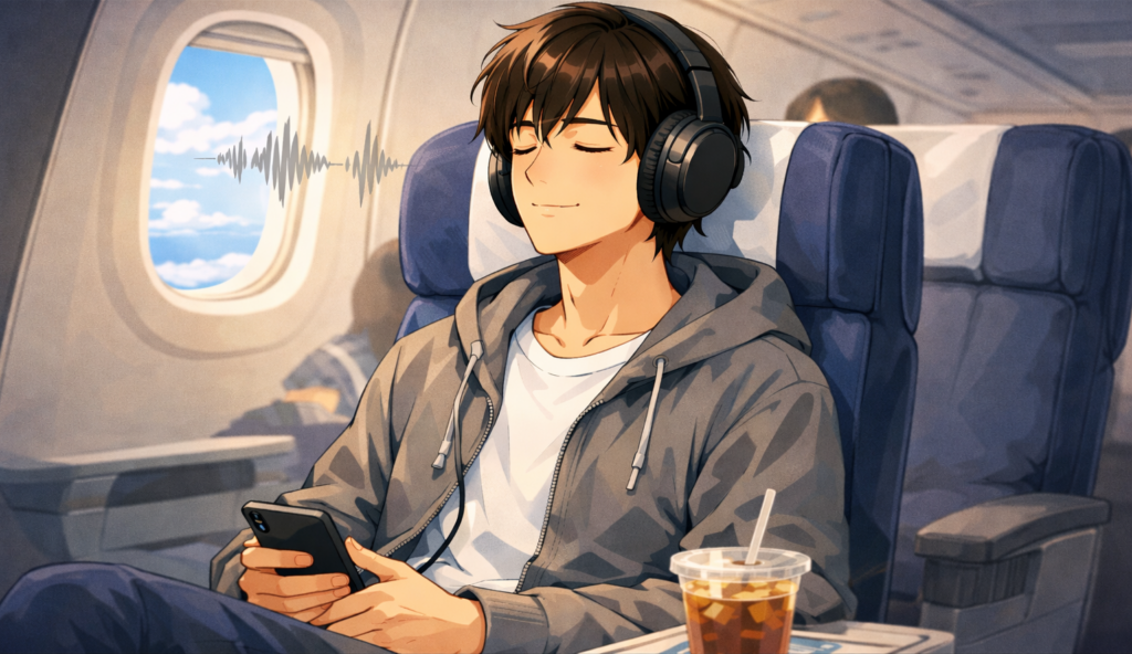 ① ノイズキャンセリングヘッドホンで機内の騒音を消す